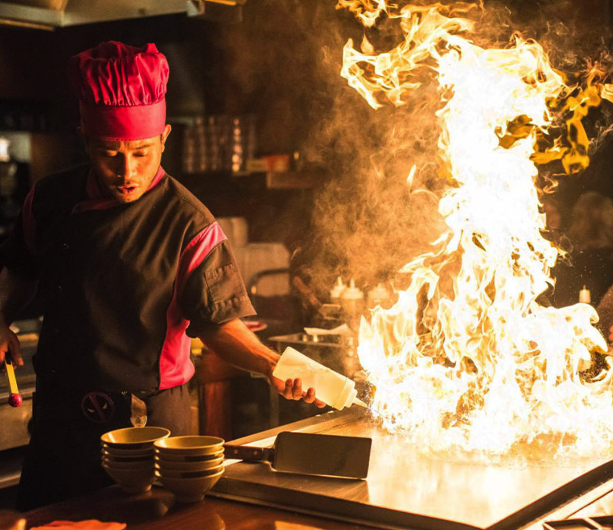 Watch your chef dazzle guests with fiery tricks while cooking everyone’s custom meal.