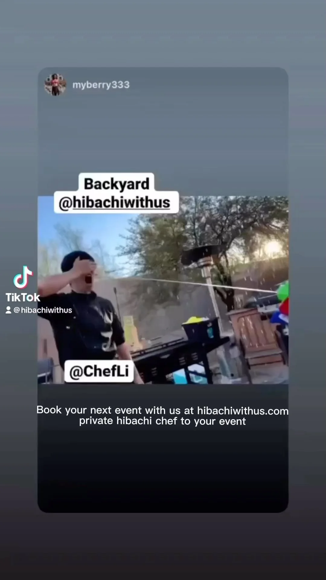 The chef arrives with a hibachi grill, fresh ingredients, and propane. No kitchen needed.You Bring the Party